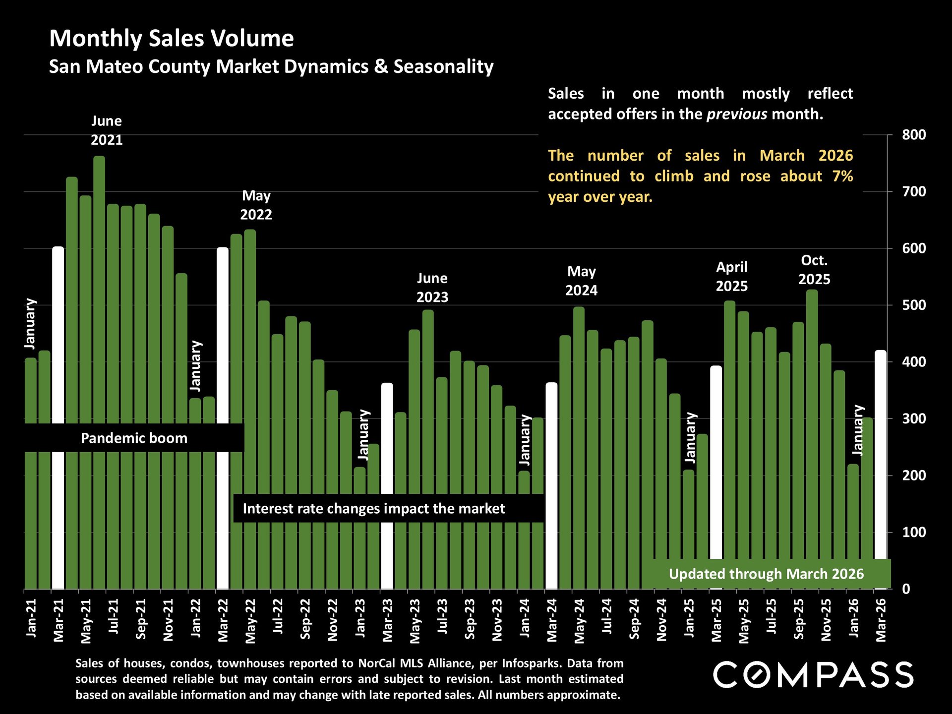 The monthly sales volume chart states that the number of sales in March 2026 continued to climb and rose about 7% year over year.