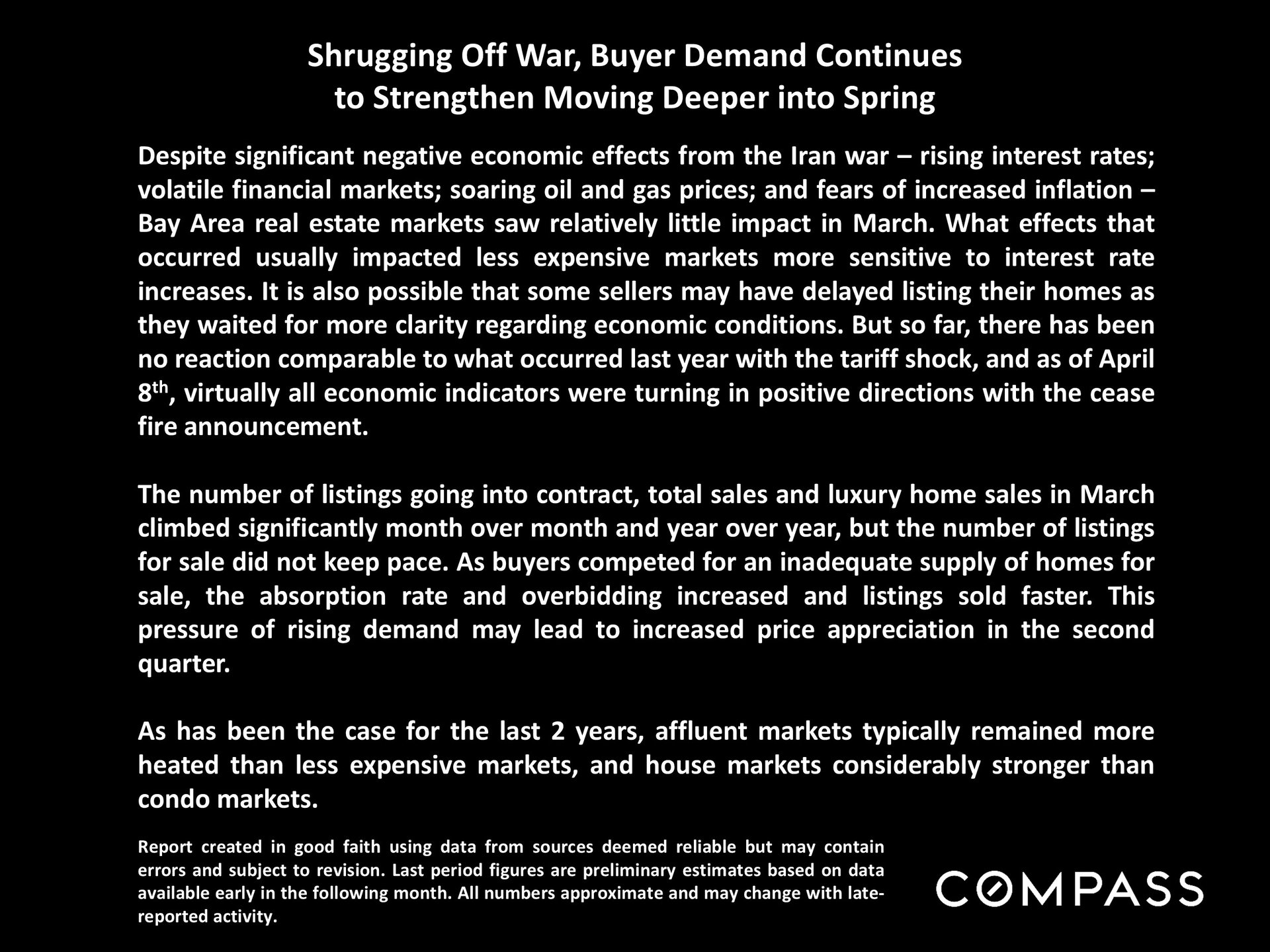 Moving deeper into spring, San Mateo County’s housing market continued to gain momentum. The narrative slide indicates that, despite negative economic effects tied to the Iran war-including rising interest rates, volatile financial markets, soaring oil and gas prices, and concerns about inflation-Bay Area real estate saw relatively little impact in March. The effects that did occur appeared to weigh more heavily on less expensive markets that are more sensitive to rate increases.