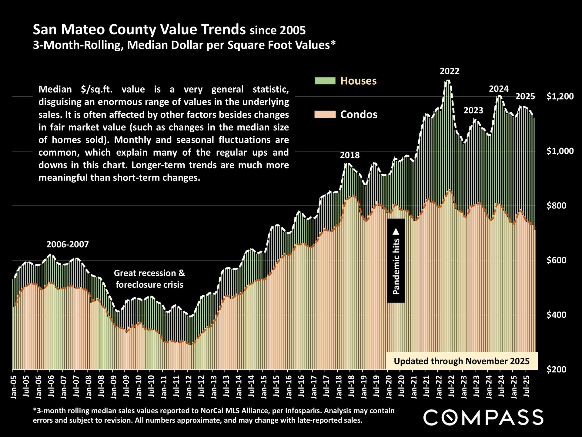The long-term $/sq.ft. trends emphasize the divergence between houses and condos: