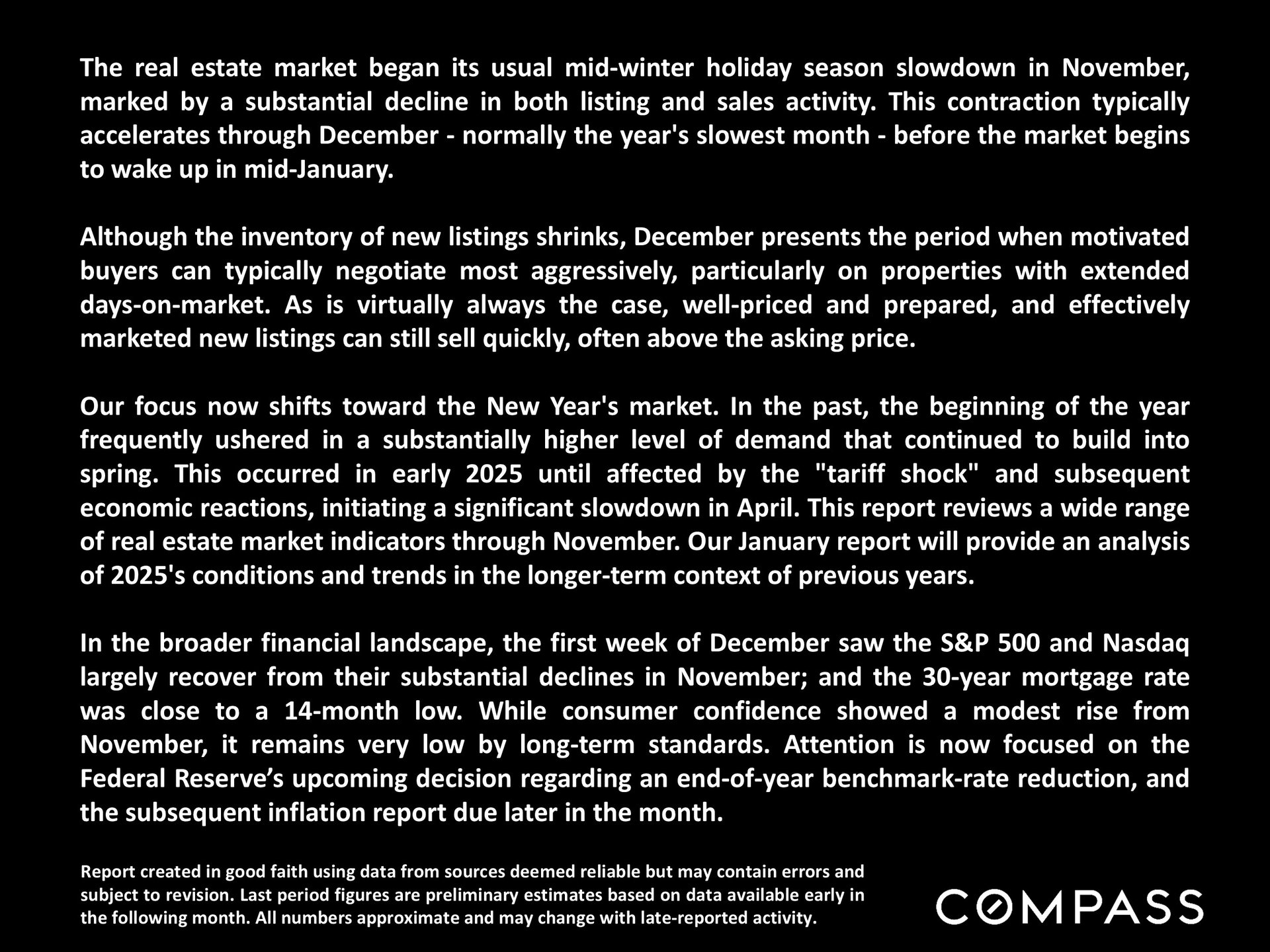 The real estate market entered its typical mid-winter slowdown in November, with a significant drop in both new listings and sales activity. This seasonal contraction typically deepens through December-historically the slowest month of the year-before buyer activity and new inventory begin to re-emerge in mid-January.