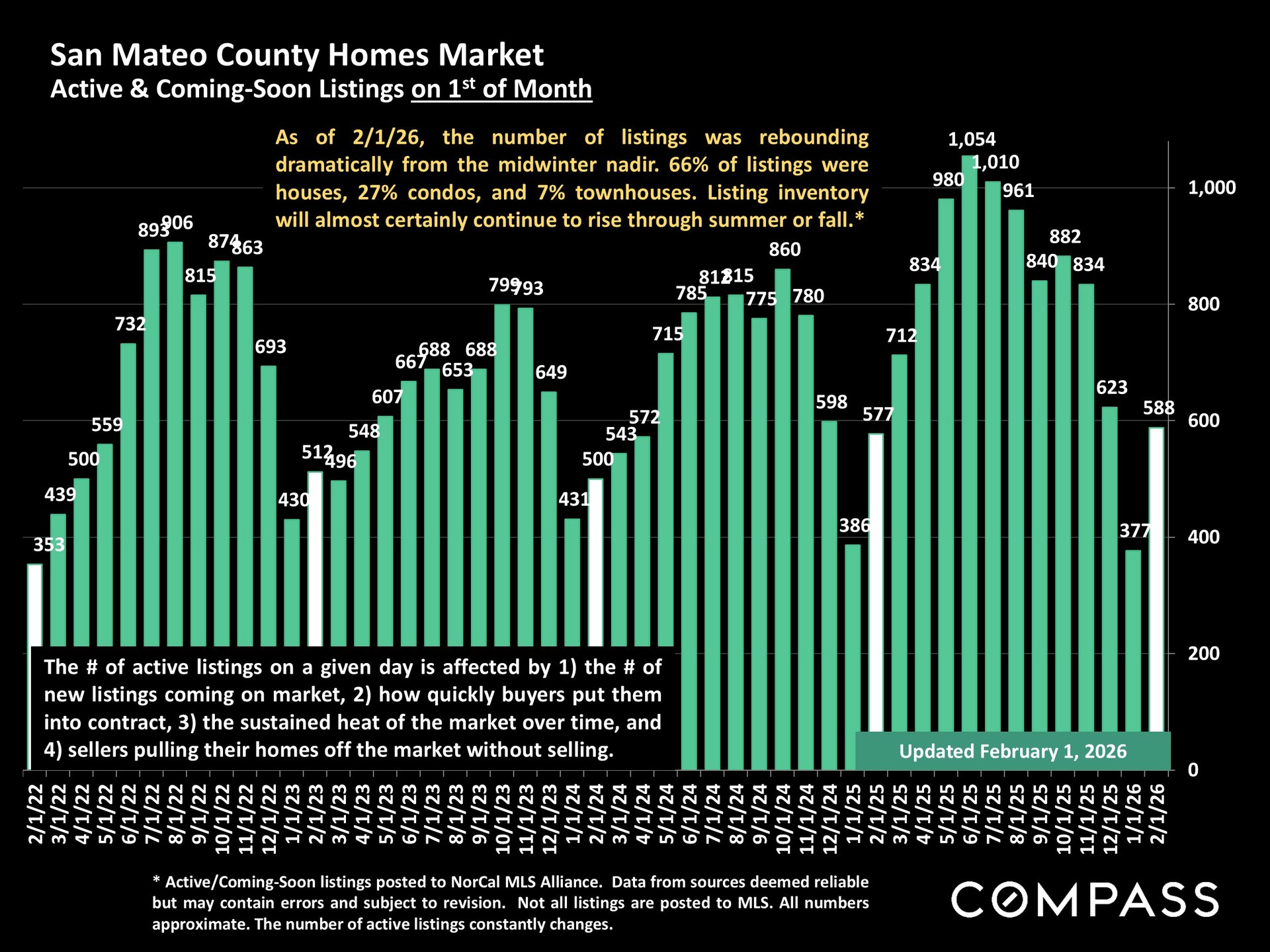 As of February 1, 2026, the number of active and coming-soon listings in San Mateo County was sharply rebounding from the midwinter nadir.