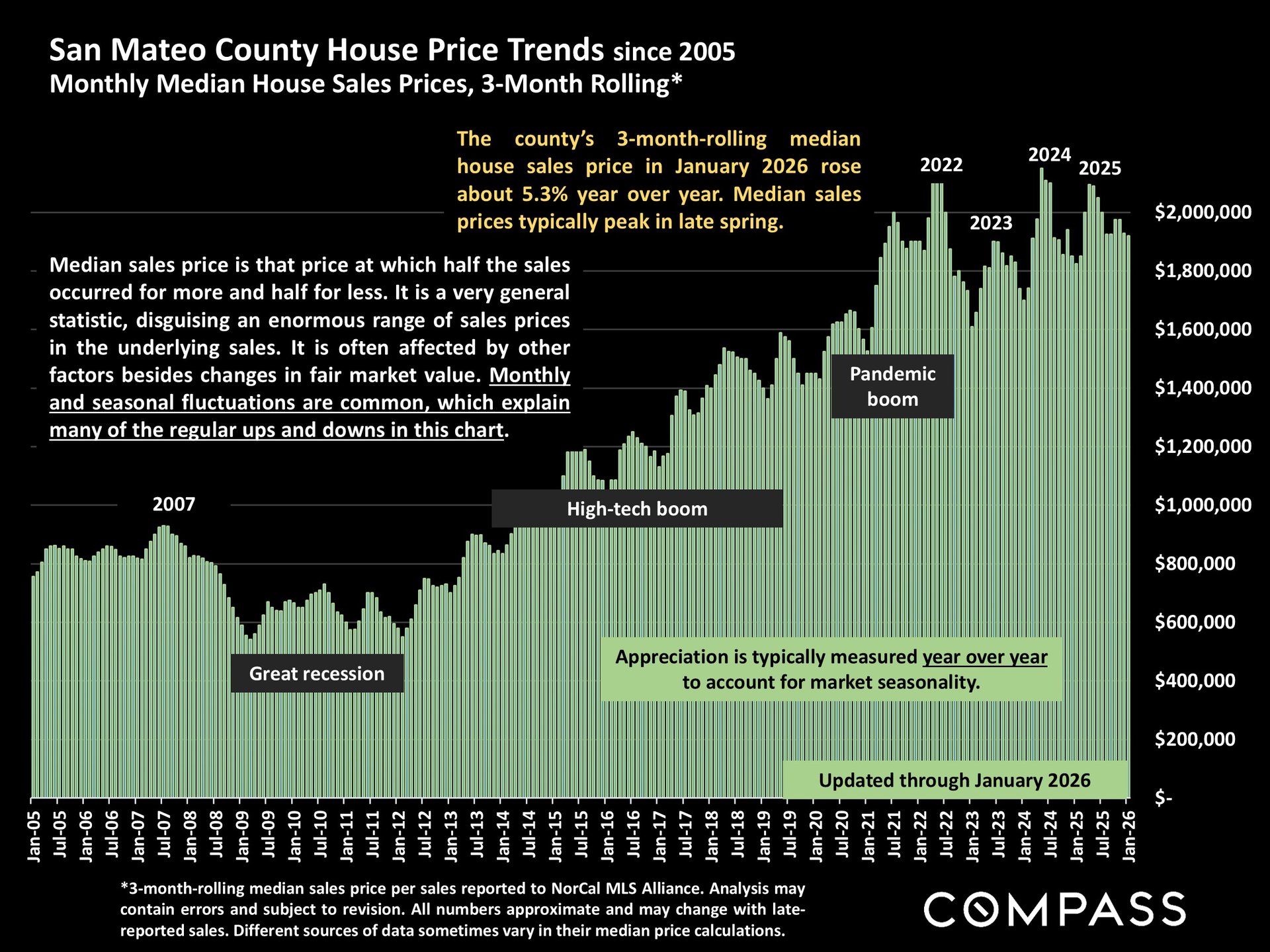 San Mateo County’s 3-month rolling median house sales price in January 2026 increased approximately 5.3% year over year.