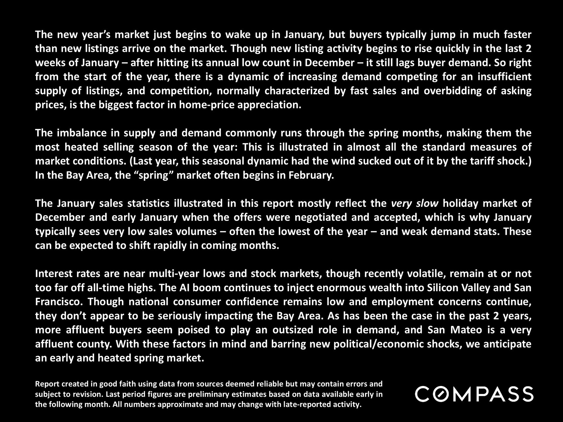 San Mateo County-one of the most affluent counties in the Bay Area-is expected to experience a strong and competitive spring season, barring new political or economic shocks.