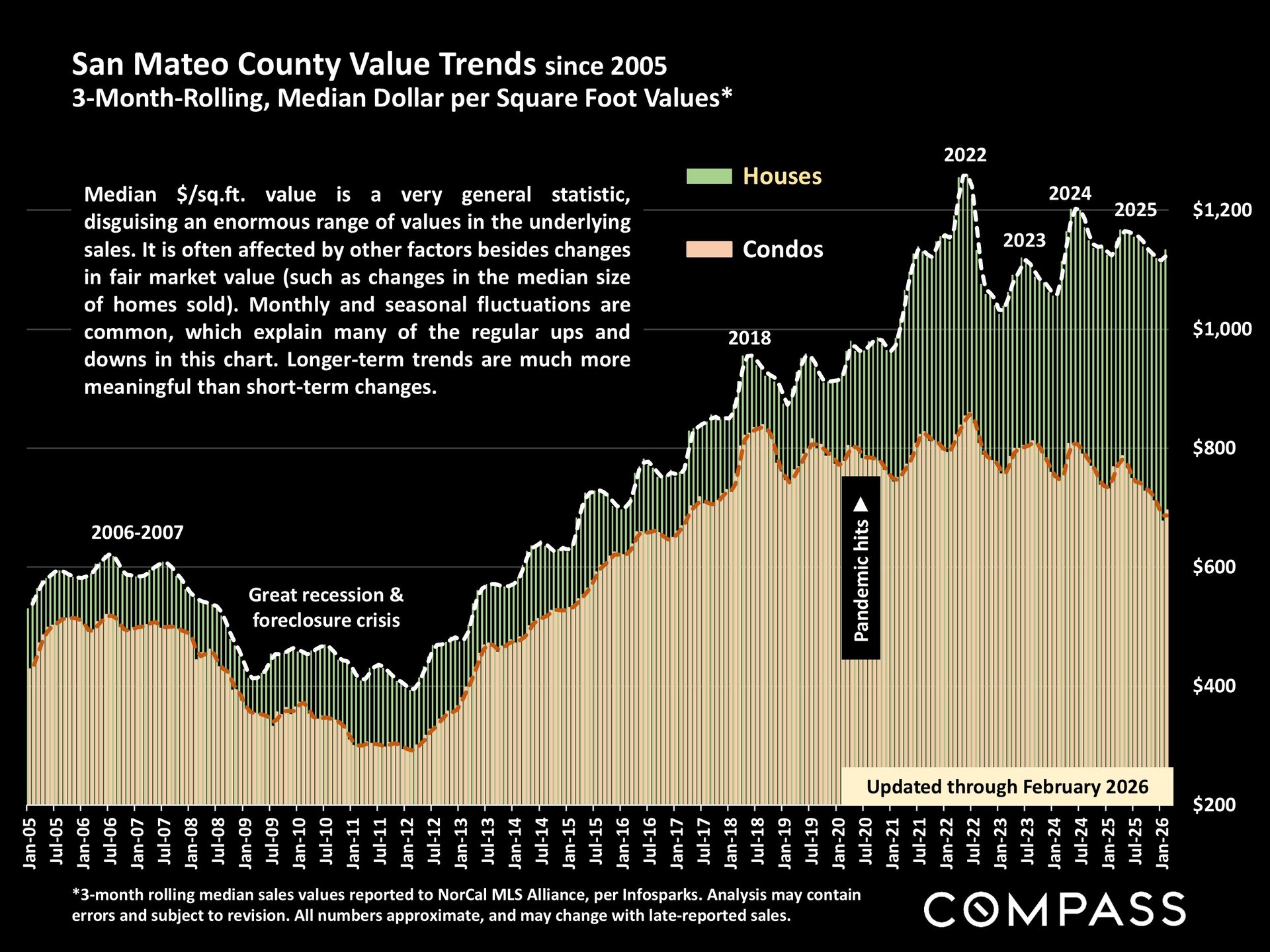 The 3-month rolling median dollar-per-square-foot chart, updated through February 2026, continues to show a substantial long-term gap between houses and condos.