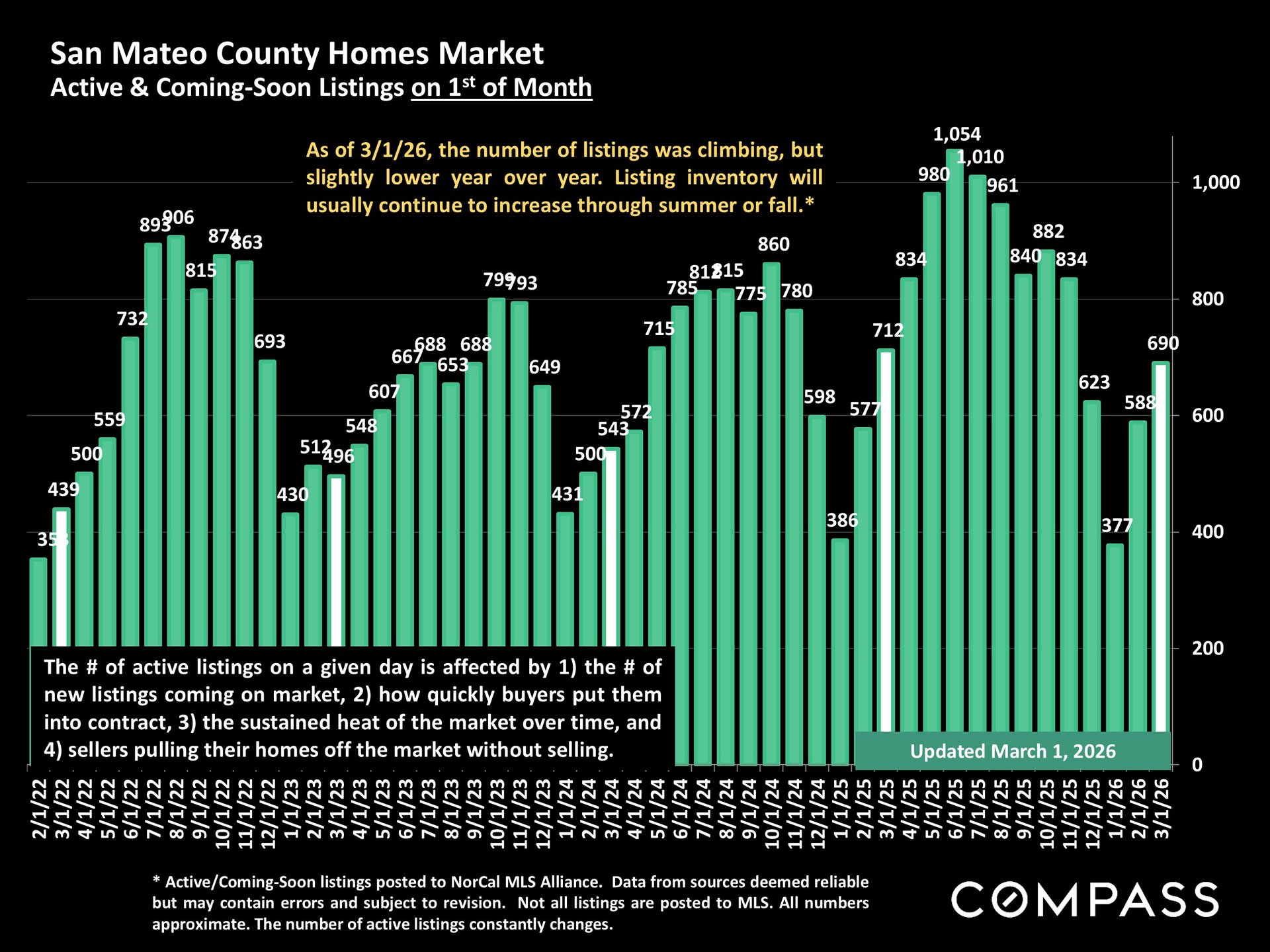 As of March 1, 2026, the number of active and coming-soon listings in San Mateo County was climbing, but was slightly lower year over year.